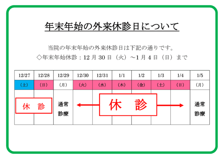 大原綜合病院 2025年12月02日(火) 大原綜合病院 年末年始の外来休診日について(12/30~1/4) 外来診療は2025年12月30日(火)~2026年1月4日(日)を休診といたします。 年始は、2026年1月5日(月)より通常通り開始します。 次の記事へ 一覧に戻る 前の記事へ